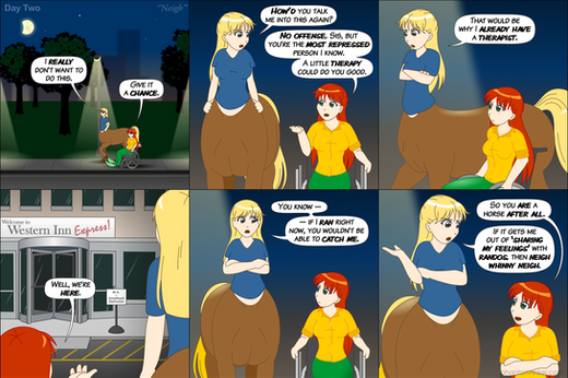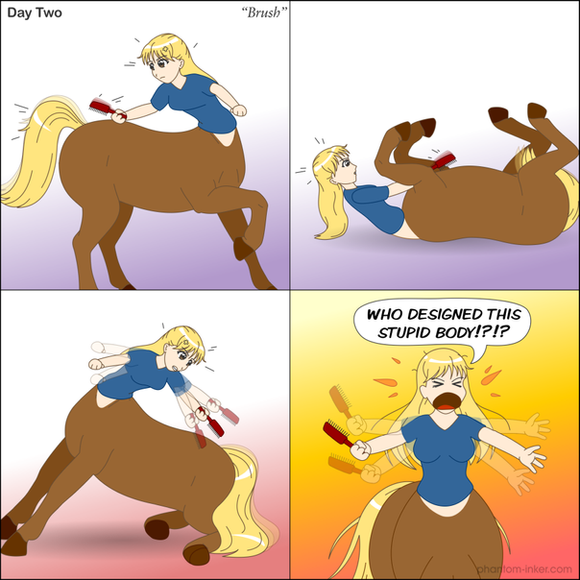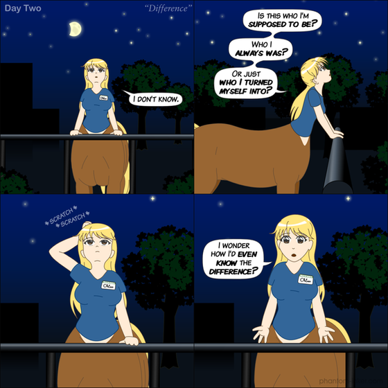 I nodded, and the impossible creature stepped past me, carefully inching through a wooden doorway that was just big enough, and then even-more-carefully clomping down the stairs. I followed her, watching her dusty blond tail bounce in the light of dusk, just like the long dusty blond hair on her head. She moved like she had always been like this, and by her story, she had. The girl I’d known wasn’t real. This massive, elegant, unnatural being before me was the reality.