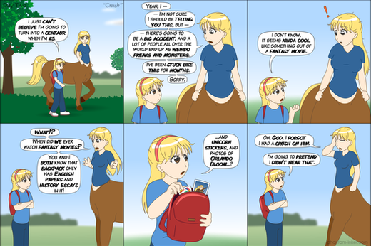 We walked the rest of the path in silence, holding hands. I didn’t care that she wasn’t human, that I had to reach up past a horse just to hold her hand. She was still the girl I’d fallen in love with. She still talked like her, smiled like her, laughed like her — and kissed like her.