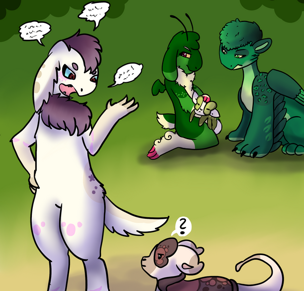 Lovin' the character interaction in this one. The background is lovely as well. Especially those tree blossoms. They add a nice splash of color to the background.