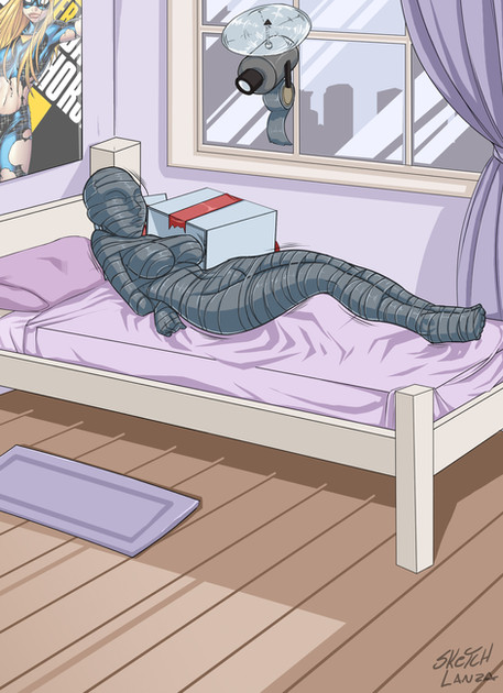 The second two layers consisted of semi-shrinking smart rubber; one that went to the unit's neck and another that coated her entirely. Obviously, the result is very, very tight! Even with the subject's constant squirming and worming, the stretchy nature keeps her limbs from getting any work done; escape is possible, but not without lots of help. If anything, it just encourages more wiggling and more resistance.