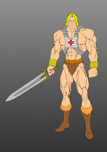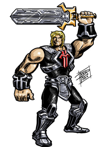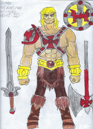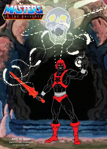 Anti He-Man would have 12 points of articulation. A ball joint at the neck, swivels at the shoulder, biceps, wrists, and waist. Sort of a hinge swivel at the hip, and a boot cut. He has removable power harness and comes with Power sword, axe, and shield.MATTEL own Masters of the Universe