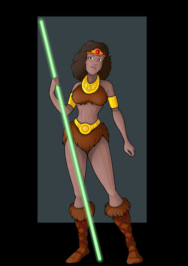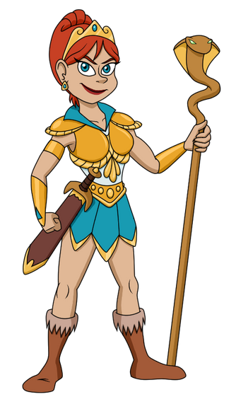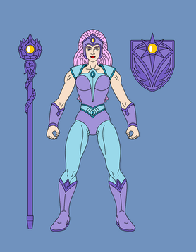 Mara of Primus would have 10 points of articulation. A ball joint at the neck, swivels at the shoulder, biceps, wrists, and waist. Sort of a hinge swivel at the hip. Her "ponytail" would be the softer rubbery material with a bendy wire in it so that it could be posed. Her shoulder pads would be molded onto her shoulders so they wouldn't hinder articulation. Her accessories include: her battle staff and shieldMATTEL owns Masters of the Universe
