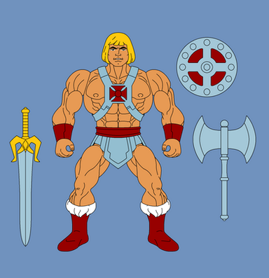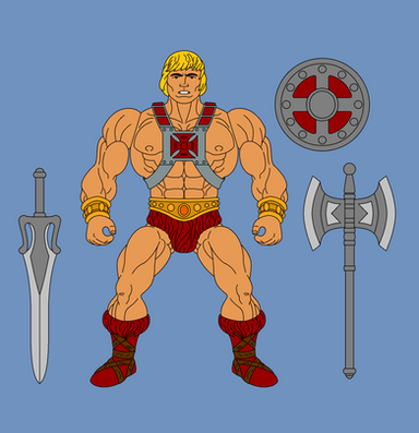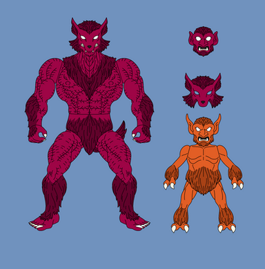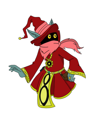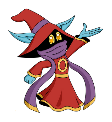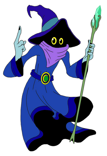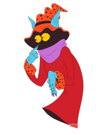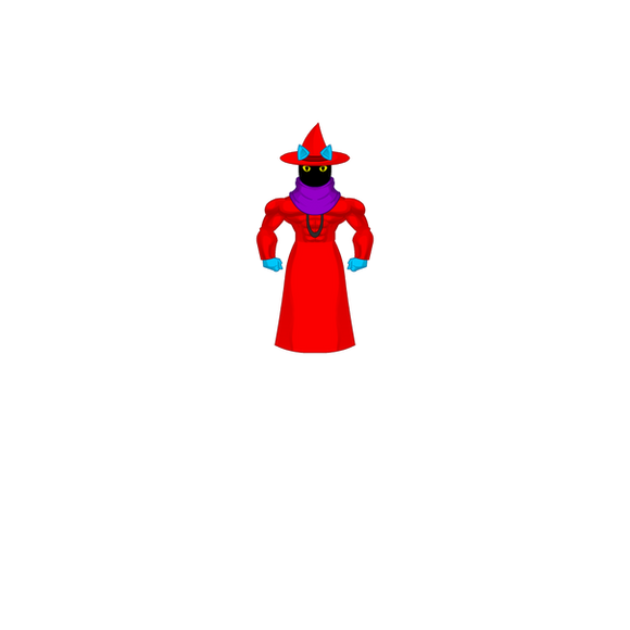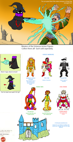 Orko, he would have 5 points of articulation. A ball jointed neck, a hinge swivel at the shoulders, and a swivel at the wrists. He actually has an action feature, the top of his hat is on a hinge and opens up so that you can place another arm in it to recreate scenes from the cartoon where he was always pulling things from his hat. His accessories include : a stand to pop into him under his cloak to give the illusion of him hovering/flying, his wand and another arm to use with the action feature. This extra arm would have 2 points of articulation : a hinge swivel like the shoulders and a swivel at the wrist. He would be capable of holding in number of accessories from other figures, such as He-Man's power sword.MATTEL owns Master of the Universe