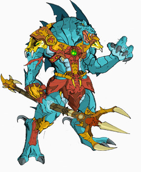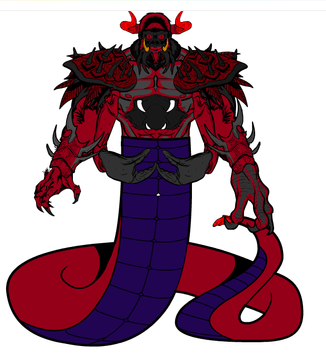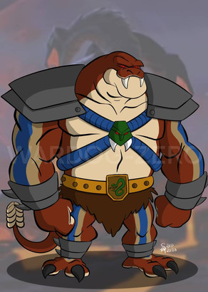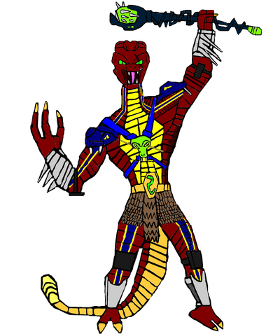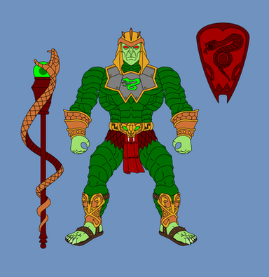 Rattlor would have 10 points of articulation. A ball joint at the neck and hinged jaw, swivels at the shoulder, biceps, and wrists. And a hinge swivel at the hip. He would have an action feature, like the classic toy there would be a button on the small of his back. Press it and his neck extends and his tail would rattle. His armor would b removable, all of it. The harness, bracers, and greaves. Aside from all the armor his only accessory is a simple snake sword. I based his look very much on the 200X appearance of the character.MATTEL owns Masters of the Universe