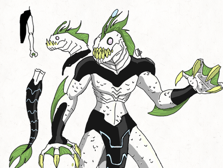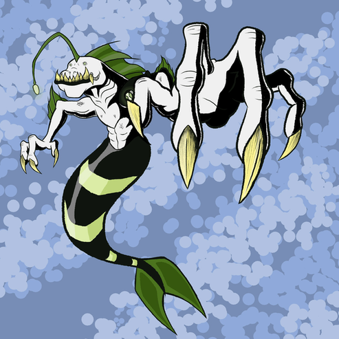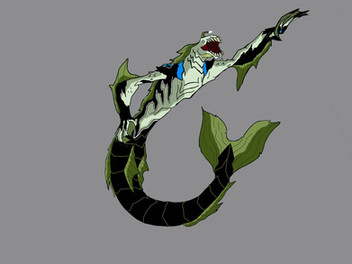 The aquatic alien Ripjaws (voiced by Fred Tatasciore) is a Piscciss Volann of the water planet Piscciss. Part alligator, part eel, part anglerfish, and part shark; Ripjaws is almost unmatched when in his element.[16]Being from a water-covered world, Ripjaws' foremost asset is his ability to breathe underwater. As the form best equipped for underwater combat, Ripjaws is usually Ben's way to deal with aquatic opponents. Possessing a powerful tail and slimy scales, Ripjaws can swim at high speeds and with amazing agility. Ripjaws can also withstand a remarkable amount of pressure, and his luminescent dangler allows him to see in the darkest of depths (or otherwise dark areas). To attack his opponents, Ripjaws has claw-tipped fins and a huge mouth filled with rows of razor-sharp teeth. His lower jaw can unhinge to allow him to swallow objects in a single bite.
