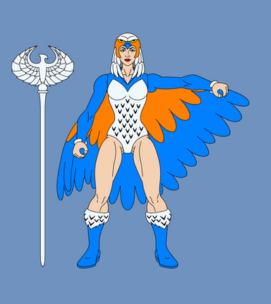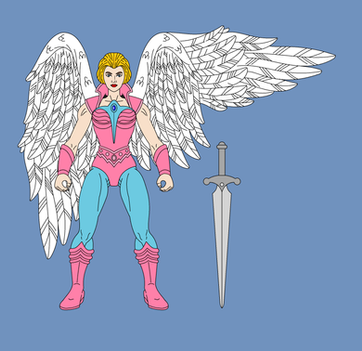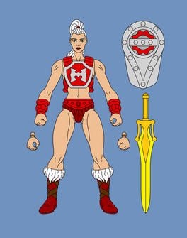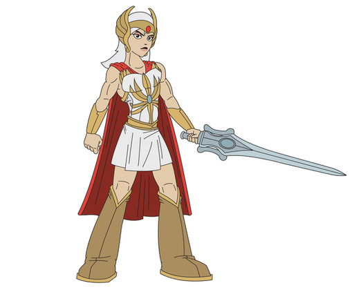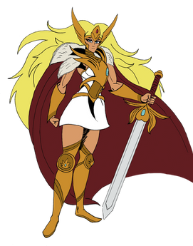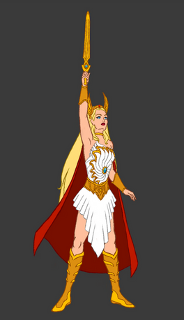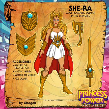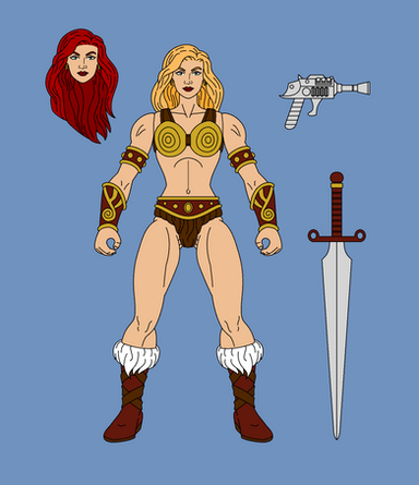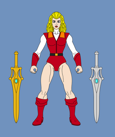 She-Ra the princess of power! She would have 12 points of articulation. A ball joint at the neck, swivels at the shoulder, biceps, wrists, and waist. Sort of a hinge swivel at the hip, and a boot cut. He skirt and cape would be made of cloth so they don't hinder articulation. Her accessories include: Sword of protection, Filmation style shield, a 200X style gold sword, and gold original style shield.MATTEL owns Masters of the Universe and She-Ra