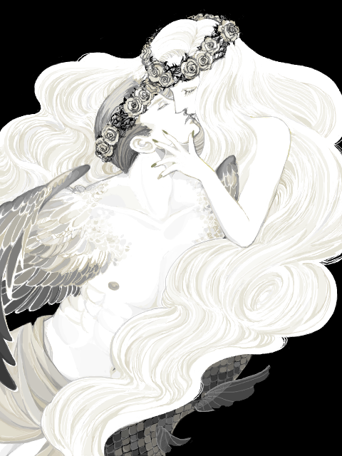 THIS. IS. PERFECT. The background is deep and beautifully textured, the skin is textured more with pen than paint so that it contrasts well, the wings are less full of value contrasts but that works to make a stronger center shape, the hair is full, well-shaped and more smoothly blended than the rest for a GREAT contrast, the expressions in the bodies/faces is VERY strong and the anatomy is the best it has EVER. BEEN. I absolutely love this, I am not kidding. AMAZING.