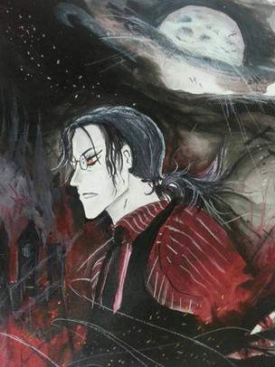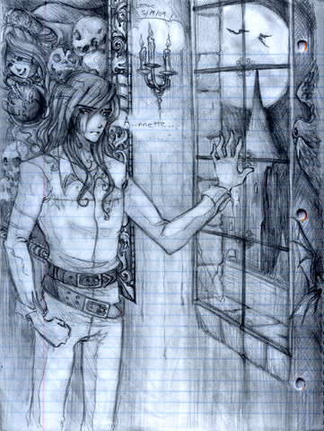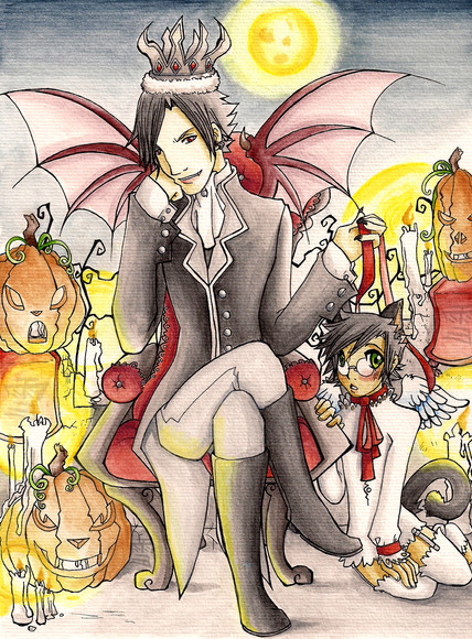 Halloween with Astaroth.Yeah, well, here it is... the main idea was just to be able to paint the whole piece of paper instead of just having a body floating in the middle like usual, so at least I accomplished that. Thank my german class for this since I was very bummed after having to write my german paper today (I'm sure the genetive case and sentence structure is completely messed up...) so... this was to make myself feel better.