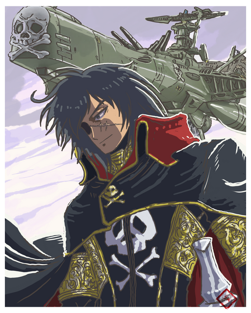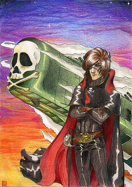 Your hair drawing skills have improved massivley, I commend you. The texture of the cape is really good, I like the cartoonyish style you got going on it fits well with this piece. Am I missing something? Is Harlock a popular TV show or something?