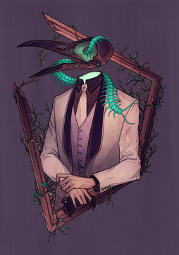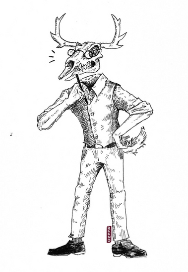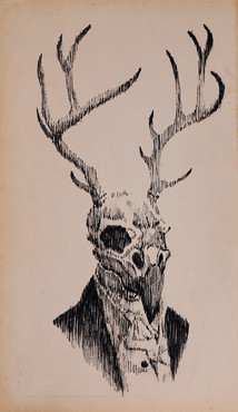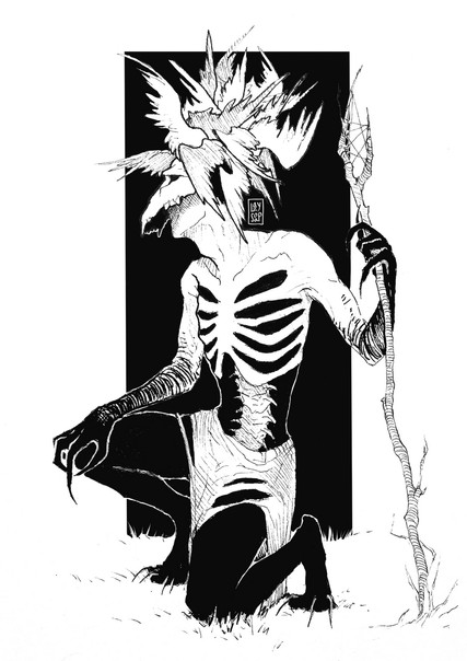An art trade piece I did forI based the skull off of the red-bellied woodpecker's, since their tongues wrap around either side of their skulls and also originate in the right nostril. Weird stuff!