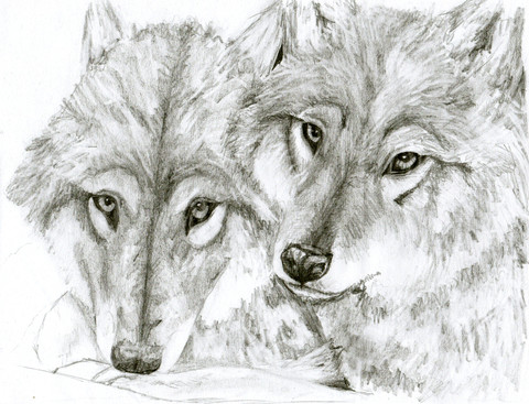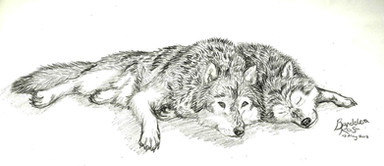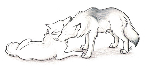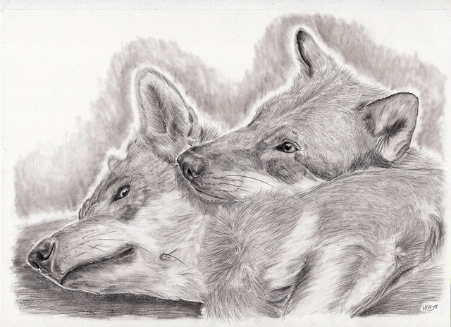 Two unnamed wolves, having a cuddle. ^^Just a sketch, but I'm particularly pleased how the wolf with her head on the ground turned out.