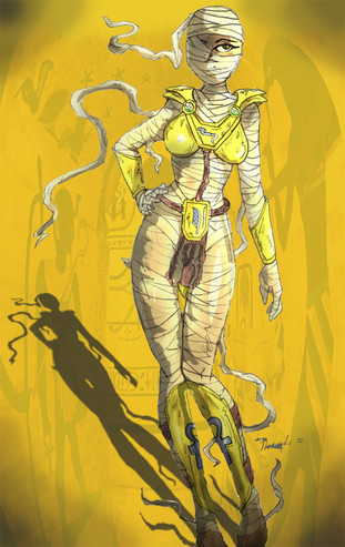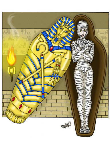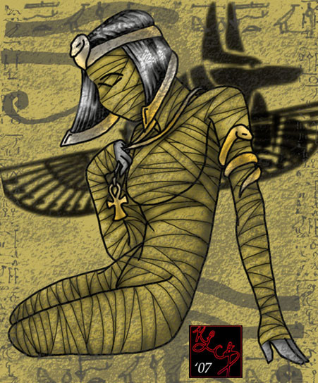 A beautiful drawing of a mostly naked ancient Egyptian beauty being mummified! Really like the hair, the eyes, the mummy wrapping gag, the breasts, the hourglass figure, the long legs and the belly button!