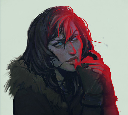 I adore the stunning details to her face; from the freckles to her exquisite eyes and her lusciously lined hair. The lighting certainly aids in exhibiting such beauty, and the sheer intensity of her otherwise monotone expression is rich with character. Wonderful work.