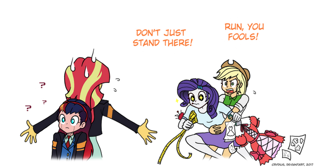 This is a parody of an Old Master Q (Lao Fu Zi) comic featuring various MLP characters including Rainbow Dash, Lightning Dust, Cloud Chaser, Sunset Shimmer, and Twilight Sparkle (Sci-Twi)...Original Comic: