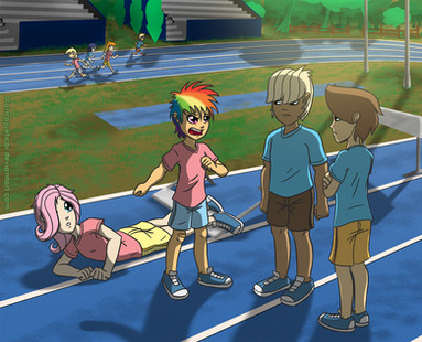 We're at the home stretch! Rainbow Dash, Lightning Dust, and Cloud Chaser are in a three-way tie and--- OHHH! Rainbow, Lightning, and Cloud Chaser are down! Sunset Shimmer, who was far behind, now ran past them! Sunset Shimmer wins the race!