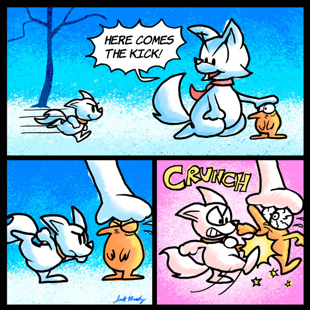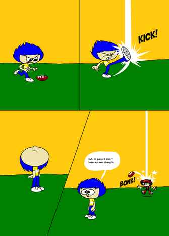 Took my time on this one...In American Football, Daisy is in full football gear and attempts to kick the ball that Max is holding over the goal post... well she made a good kick, but that wasn't the ball she kicked...