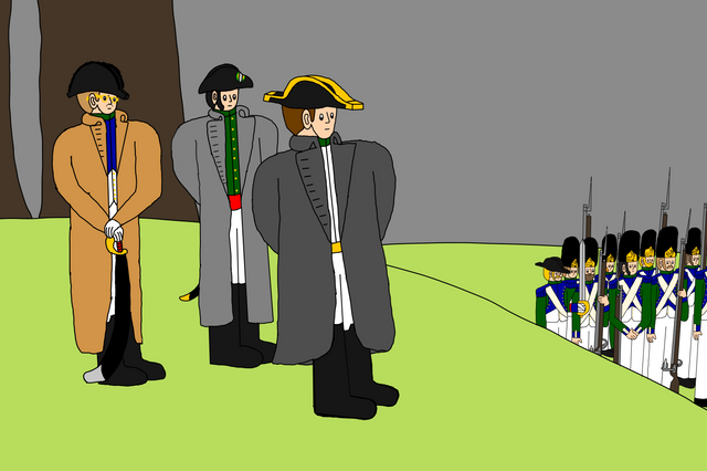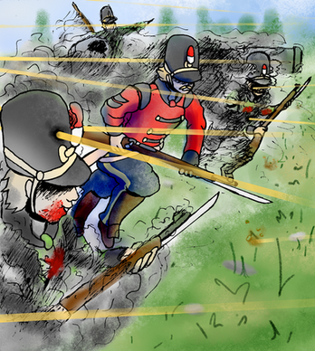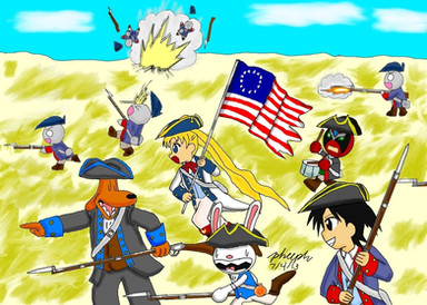 1778...War between two factions drag on... musket fire and artillery fly in different directions. Soldiers on both sides are taking casualties...