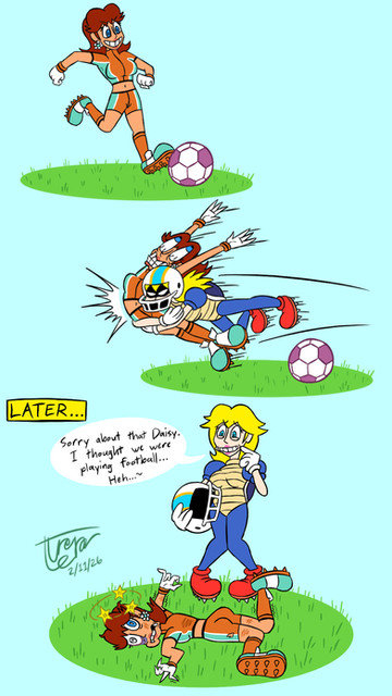 ...And it looks like Luigi ends up getting tackled (and losing hold of the ball which would be a fumble) by Daisy, who was coming in real fast...