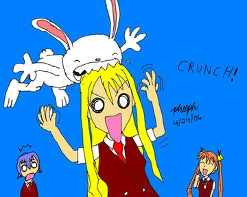 This is actually the first fan art pic that included the Rabbids from Rayman Raving Rabbids.Tsukuyomi, the psycho swordswoman from Negima, faces off against overwhelming numbers of Rabbids.