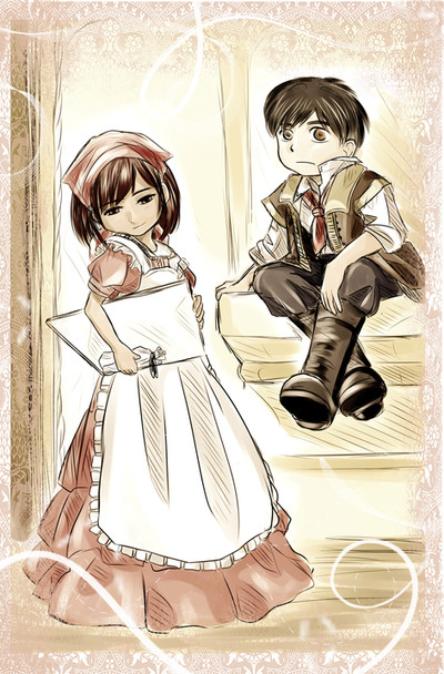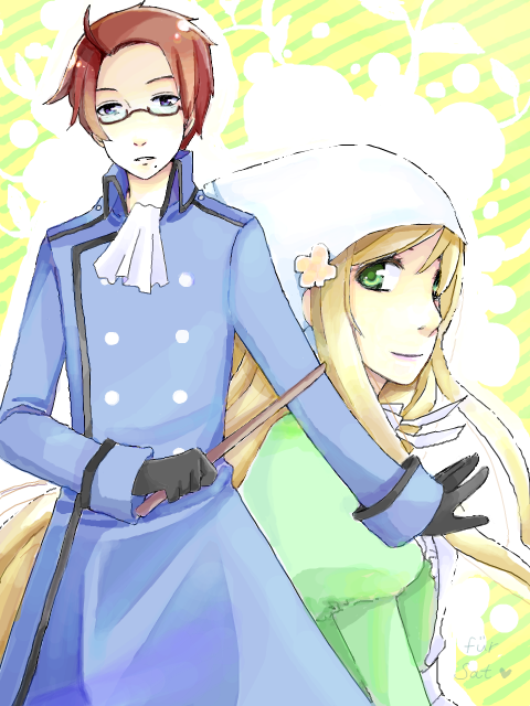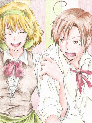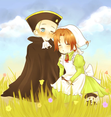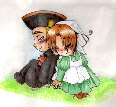 Right. Explanations are due. I apologise for my lack of uploads, despite it being summer. I honestly have sketched during my absence, so I will try to upload those soon.Also, this is a, as you can see, fanart picture showing Monsieur Angleterre et Mademoiselle Vietnam. Yes, this is a crack pairing, and yes as I've mentioned before, I suck at backgrounds, So I fill it up with junk, as you can see.