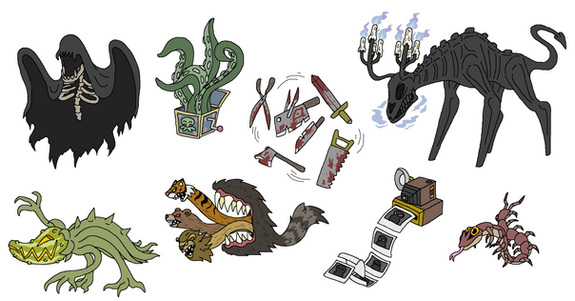 Slime Creature, Possessed Doll, Cyclops, Krampus, Mothman, Demon, Giant Spider, Centaur, Frankenstein's Monster