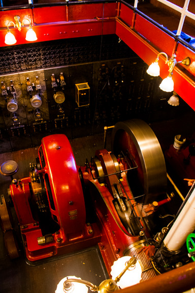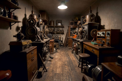 Where all repairs are made. The cabinets were built by the chief engineer previous to Conrad. Even though it is no longer used, much of the original line shafting is intact. Shown working is Francisco, the man who SHOULD have been the new chief.Related content