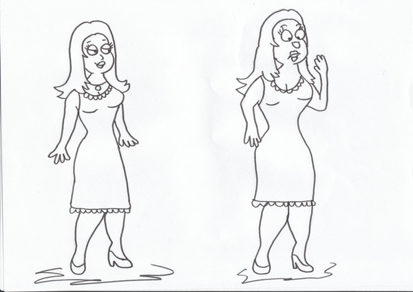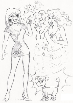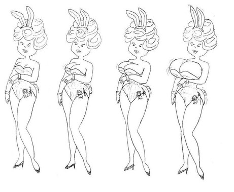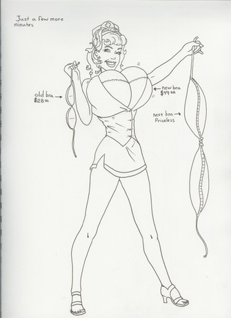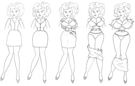 Another old drawing sequence -- mostly BE, but I filled out her hips a bit too -- done by tracing a cartoon figure and modifying it successively. A little different breast shape than I usually like to do, hence the title.It looks like she's making a wish in the first picture, and in the next two, it comes true! Unfortunately she forgot to include adjustments to her clothes in her wish!