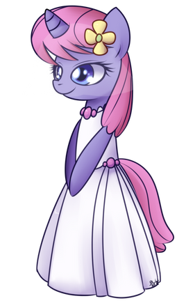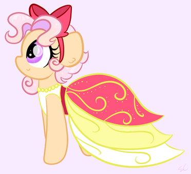 Cheerilee never gets invited to parties. She wasn't at the Gala or the wedding and I can't recall any other party in which she was present. And she stayed home on Nightmare Night.Anyway, this (in my mind) would be her dress she'd wear if she ever got an invite to a party. It took a long time to get this design right, or at least to a point at which I could say, "Yep, that's a dress Cheerilee would wear." Obviously it's based heavily on her colors and her cutie mark.