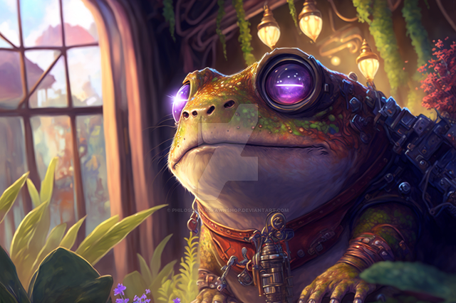 #ai #anthropomorphic #atmospheric #characterconcept #characterdesign #dramaticlighting #fantasy #frog #green #jungle #red #steampunk #swamp #toad #vividcolors #anthrocharacter #aiart