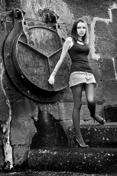 This is a well composed, well lit shot. The lines in the background emphasize the lines of the model. Great job.