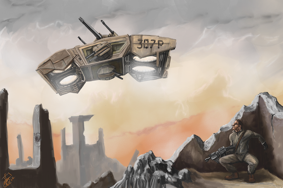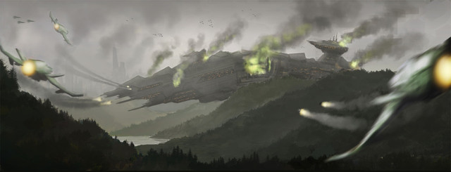There's no specific story behind this piece, i just opened up photoshop and started drawing and out it came.My own interpretation of it is a fleet sent to colonize a planet, sending in the troops first to make sure there's no hostile life.