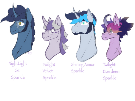 I previously hadn't put that much thought into my characters Spencer Junior and Midnight Might parents, other than the ponies I had who I'd based them off of. Once I established that those oc's of mine where one of their parents, I left it at that. Now I finally set my mind on completing the family trees. So here ya go.