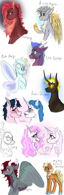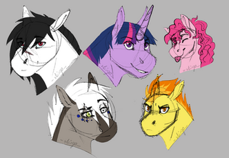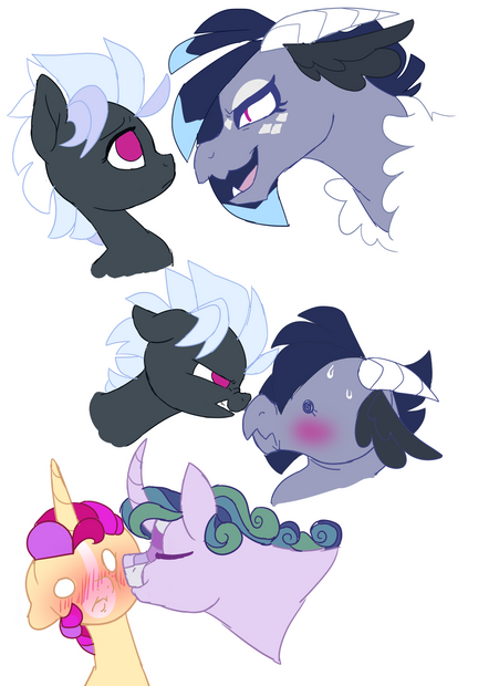 Could not sleep last night so I made the poor decision to plug in the Wacom Cintiq and make this, keeping me up for another few hours.Up top is just a silly doodle I'd made but then liked the way it turned out so I gave it black lines and colored it. My sister's ponysona (whose name she doesn't approve of, but I refuse to change it) and another, fairly new oc of mine who is roughly based off one of my sister's close friends. My lil sis doesn't exactly know who/what she's attracted (she's a young teen, aint nothin' wrong with that). So I've changed my opinions on the Solderfall ship and have happily changed it to this one. I can't think of a name for it so if anyone can think of a cute/ catchy ship name that combines Velvet Snowfall and Night Breeze, you'd be doin' me a huge favor.