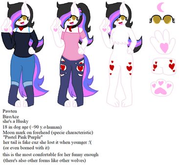 Typical Clothing: As a human: A sweater with designs similar to her patterns as a doge, a tiny beauty dot, a skirt, and her signature purple flower- her shoes do not matter, and are almost always just boots or sneakers. Feral: double ear piercings, a tiny beauty dot, and of course, her purple flower.