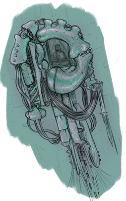 Another concept for my nightmare video game design project. This train is found inside this guy's stomach(warning, crummy old picture):[link]