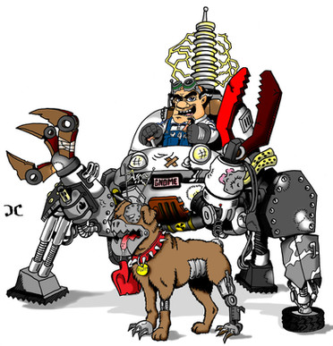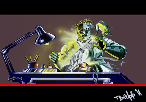 Whenever I look at this, it looks like the mad scientist is holding a plush robot chicken and I always hear a squeaky sound effect going on in my head.