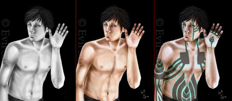Detail:Spock near his breaking point in the hands of a particularly nasty Romulan from my novel Star Trek: Treason [link] . The tattoo and strange haircut is from his attempt to blend in as a Romulan during a failed rescue. Vulcans are difficult to break and once you do they are pretty much insane and not really of any use to anyone.