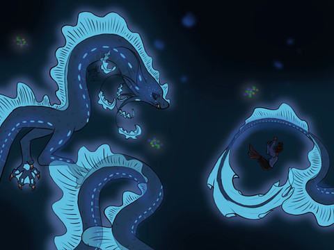 All around her, bodies shot through the darkness, and she would have shivered, were such motions permitted by her current environment. Giant squid were an earthly nightmare. Fronterra was a new world with new secrets. There could be literally anything down there.