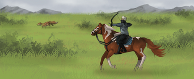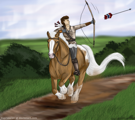 Hunting Speciality Prompt: Hunting birds with a bow or rifle can be a tricky task, but when big herds aren't available, relying on the small game can be essential. Depict your rider hunting small birds with a bow or flintlock from horseback.