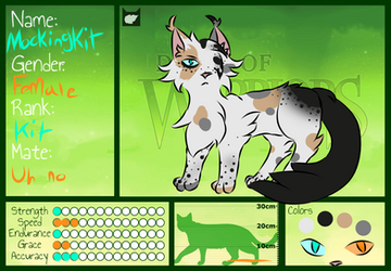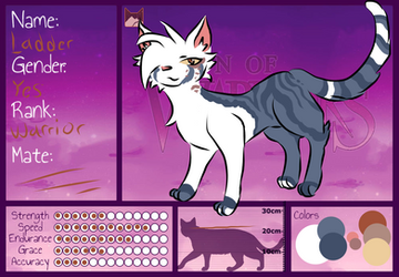 Appearance - A white and blueish grey tom with almost black stripes and markings along his back and covering his face and ears including a crescent moon like his father. His tail is incredibly long and his eyes are narrow and a burning amber colour. He is tall and muscular but not quite as bulky as his father having a lankier frame.