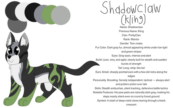 History - Born the son of Moonflare and Arcticrose, mentor and cowardly apprentice turned mates. He and his sister were born their birthcausing complications for their small mother. The labour went without death although Arcticrose suffered damage to her body, leading to a sooner retirement. They were named Shadowkit, a name which had appeared in her family several times and for his pelt, a darker version of his fathers. The other was named Chillkit for their mother despite his brighter fur.