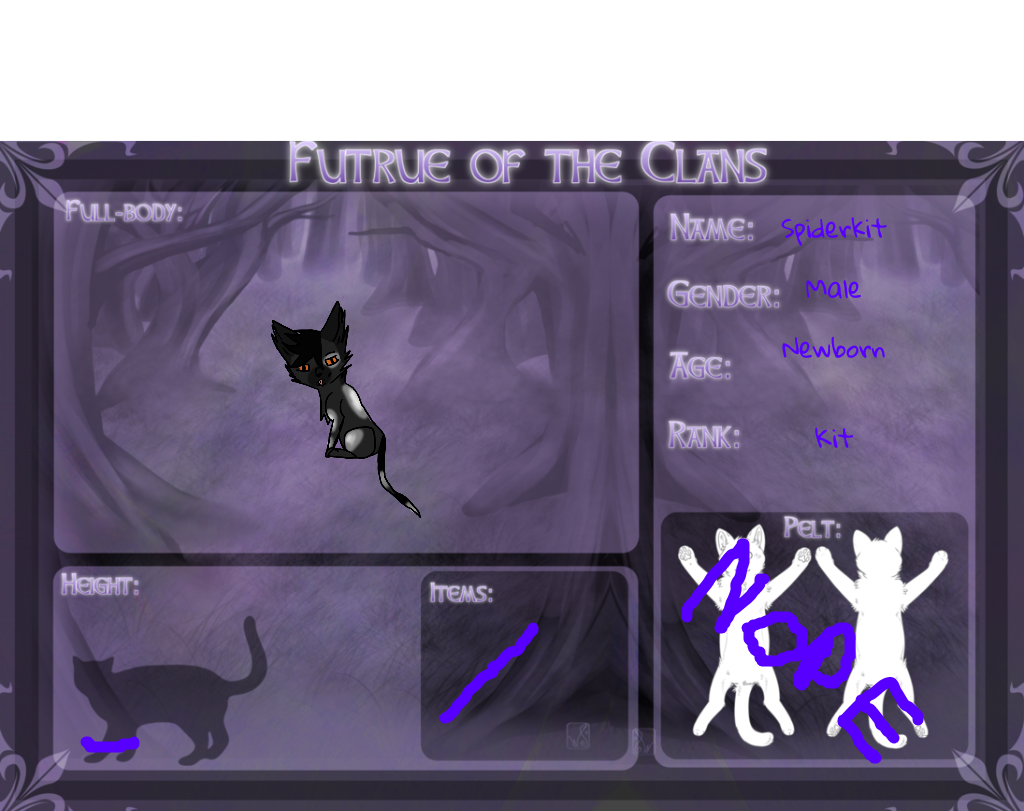 HighClan was the absolute place to be. An overabundance of prey and activity going on constantly in the camp made it a welcoming home and the weather and atmosphere in the new territory made it fun and exciting. admittedly, Grapekit didn't know anything but the new territory. Being born by a mysterious pregnant LeafClan she-cat and given to her father, Grapekit couldn't remember any time beyond being raised by her single father Charredoak, the hardiest tom she'd ever met. the small, plump kit loved stumbling about the clearing of the camp chasing bugs and warrior tails, or finding the comfiest nooks and crannies to rest within, which often contained a large amount of the same beetles and bugs she loved to chase. Everything was perfect. the prey pile was always fully stocked for her pickings, which were always large considering her age (No wonder she was so plump) and there was always a relaxing breeze that tugged through the calm camp.