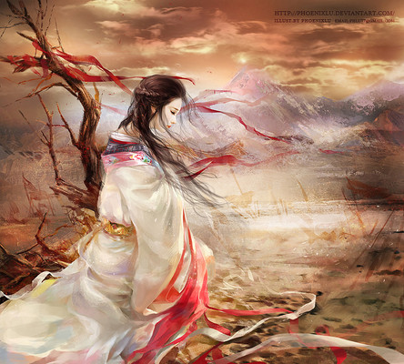 will the colors be a bit more accentuated as a book cover? bit more dark might help the character pop out more... don't know why it seems so. maybe it's just me wanting to see more darkness in this piece... I don't know where to look at the village behind or at Liu RuShi, was it your intention?