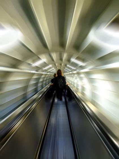 Contrast between stillness and motion, cold and warm colors and light vs (relative) darkness is awesome. The only thing that is a bit out of whack is near vs far. The few rows of OOF bars in front is somewhat incongruent. Perhaps a tiny bit of crop?