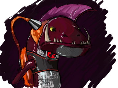 For a quick rundown, Fishface used to be a goon of the Shredder's named Xever, along with a Chuck Norris knockoff called Bradford. At one point, the Shredder gets his hands on Kraang mutagen (The Kraang being this universe's obligatory "Brain guys in human suits", and are a combination of the Utroms and Krang, being evil scientists from Dimension X) and turns them into fish and wolf mutants Mikey nicknames Fishface and Dogpound.