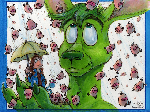 Here's Duncan Roo & the gang on Godzilla for some reason. Duncan is showing Dudley ( the 'lil dragon on Duncan's finger ), how Godzooky defies gravity and probably many other rules of the physical universe. Ralph & Foof are just there for the ride. I think Godzilla ( who's was drawn from mixture of the Godzilla reference I had laying around ), is rethinking his current life choices.Related content