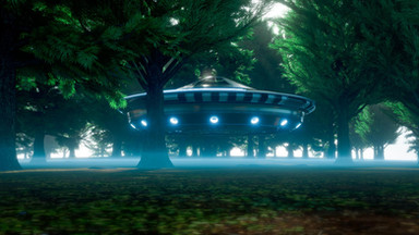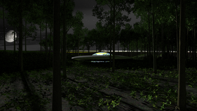 Just a quick test - I wanted to see if it might be worthwhile to generate a sequence (in 3-D, of course!) that shows the saucer lifting off. This would be from the point of view of a third person we didn't know about - this person's other two friends turned up missing and when they went looking, found this spaceship.