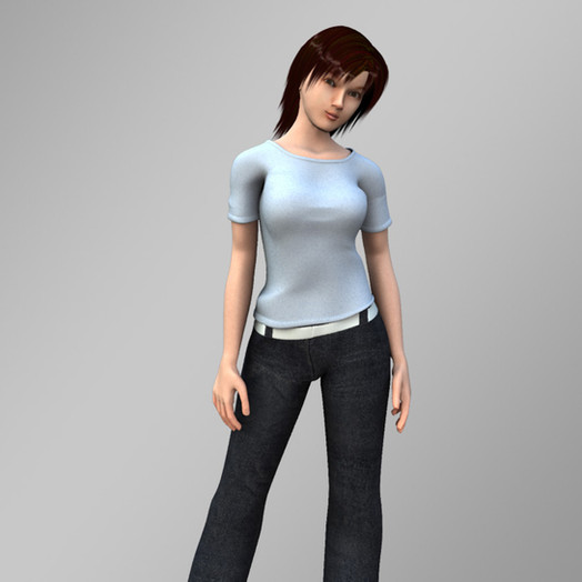 Hi all! I'm working on the next thing and I'm getting stuck early on with this problem in the cloth room: little "stringers" hanging off the edges of the clothing.I started with a Simple T-Shirt from 3D Age. I couldn't easily conform it to this model (Digital Creations' Amelia for V4) so I used the trick I'd done before, successfully, with M4: convert the conforming garment to an image and use my Python scripts to fit it to the target. That didn't work. I tried the Fitting Room - that just makes a skin tight t-shirt which looked really weird on this model.