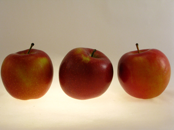 Really interesting concept, and I like how the apples are fully one colour instead of a red with yellows in it and the like. The light reflecting off the apples also adds texture to the photo by showing how smooth they are. I also really like the simplicity of this; it's simple but really intriguing. However, the white background is coming off as a dull grey, and I think it detracts quite a lot from the image. Very creative though. Keep up the good work