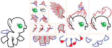 I find a vectored image, and copy/paste it to MS paint, and use the "free-form selection" tool to remove the mane, tail, any accessories. I then use the Curve tool and sometimes the pencil to re-do the outlines, and fix places where the colour is removed with paint bucket. Then i make sure it is not pixel-y when re-coloured, and add the rules beside the finished base.